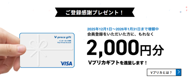新規登録でVプリカを2,000円分プレゼントするキャンペーン中!